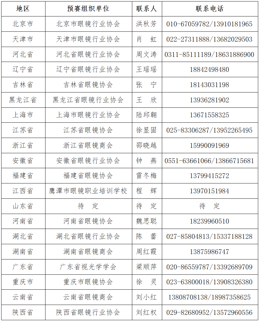预赛相关问题可咨询上表中省市自治区眼镜协会(商会)、相关单位负责人。
