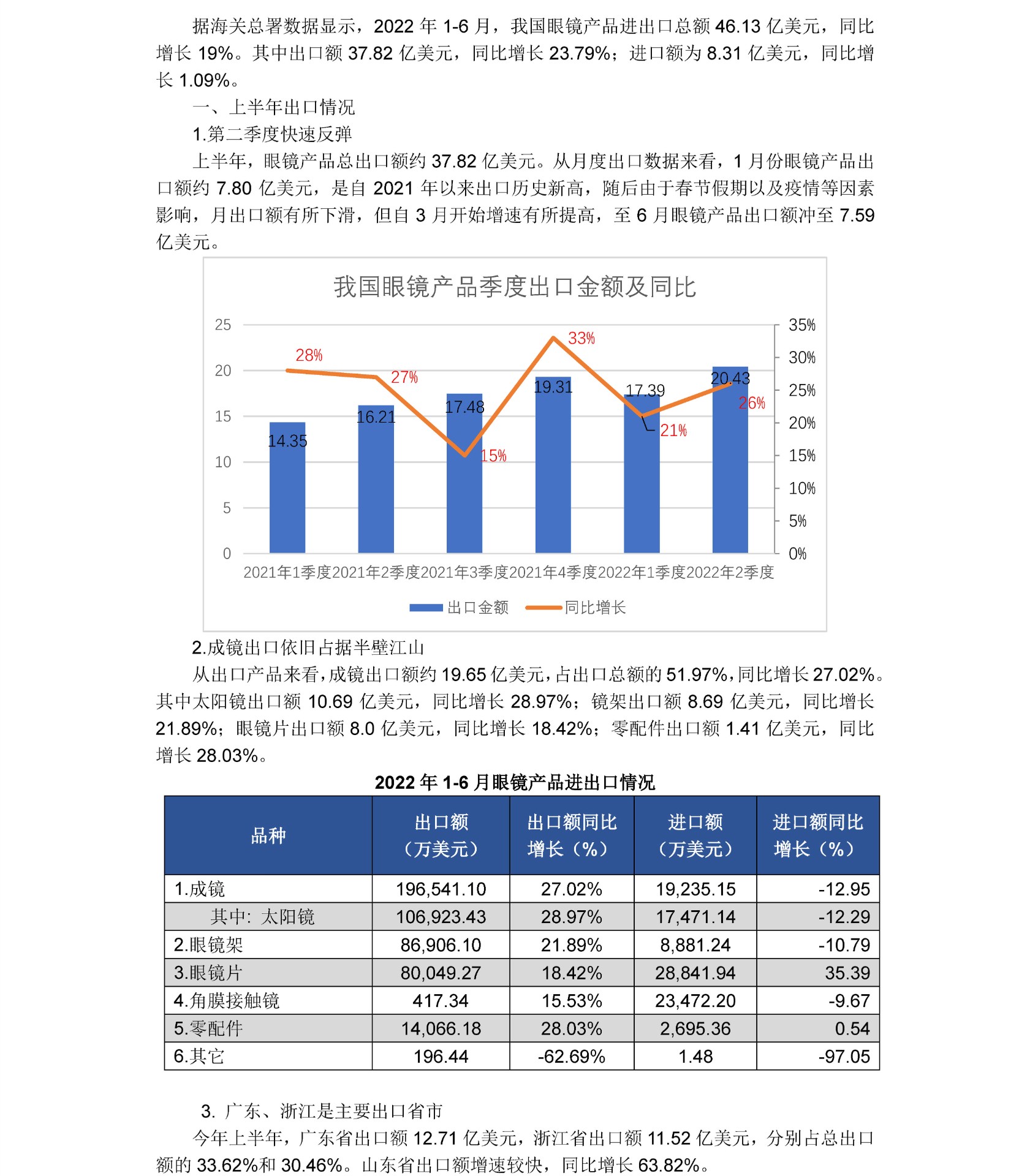 2022年1-6月眼镜产品进出口情况
